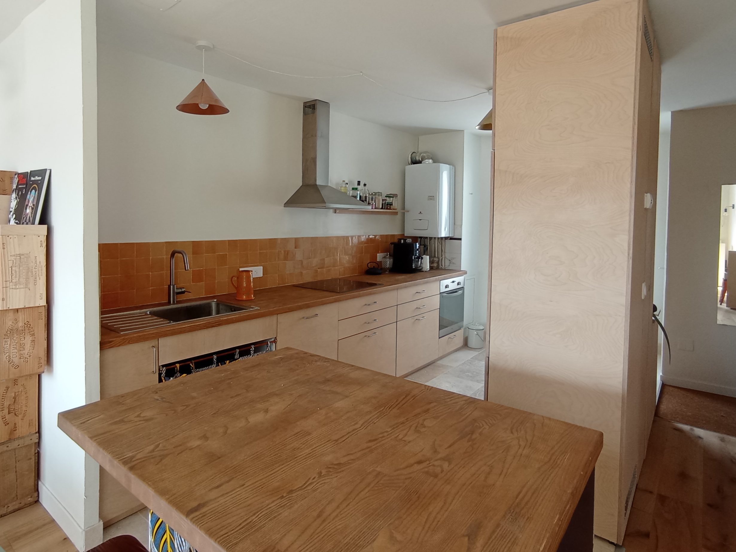 Dimensions : plan de travail 4 m, îlot central 1,20 m x 0,90 m,