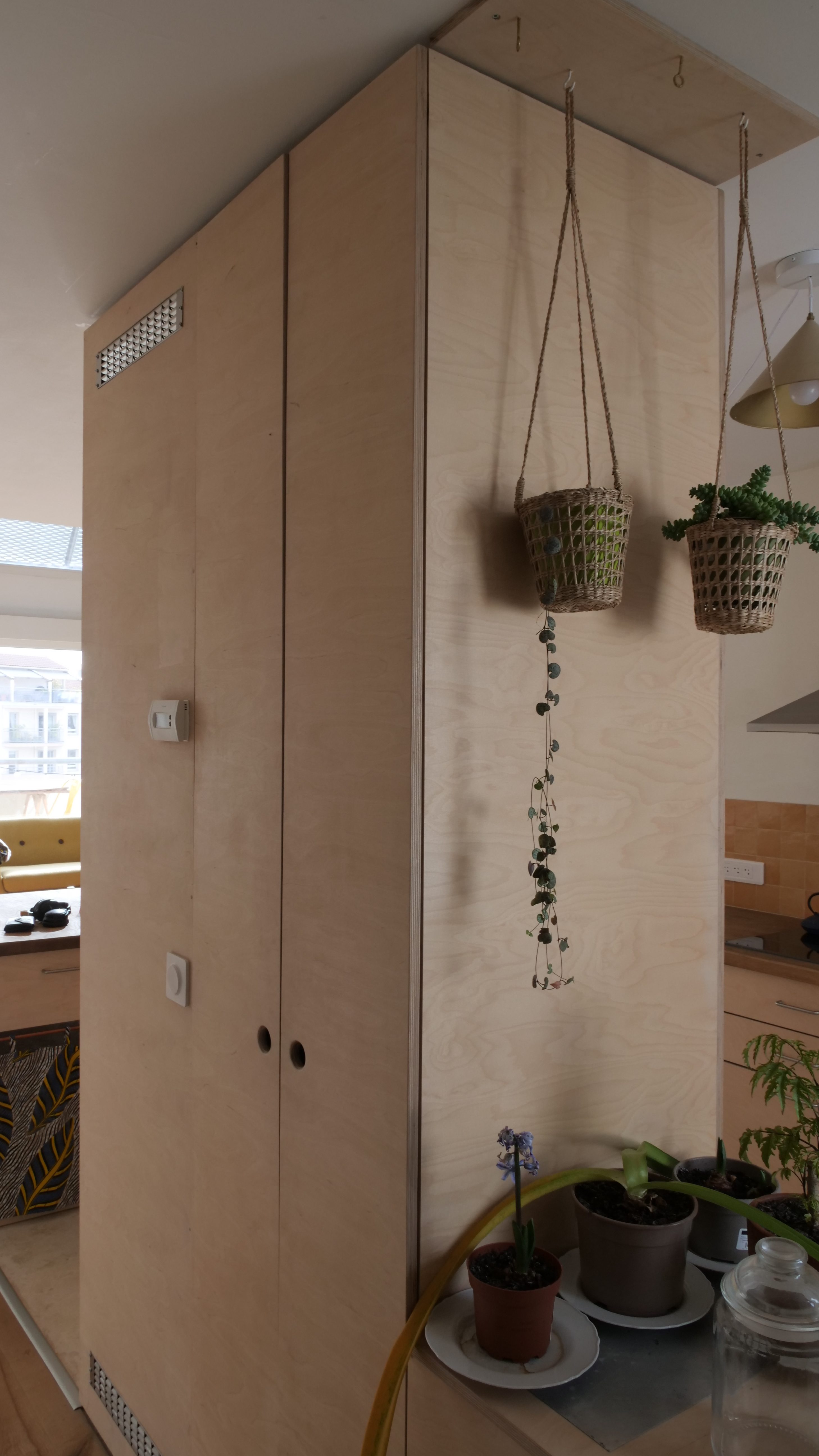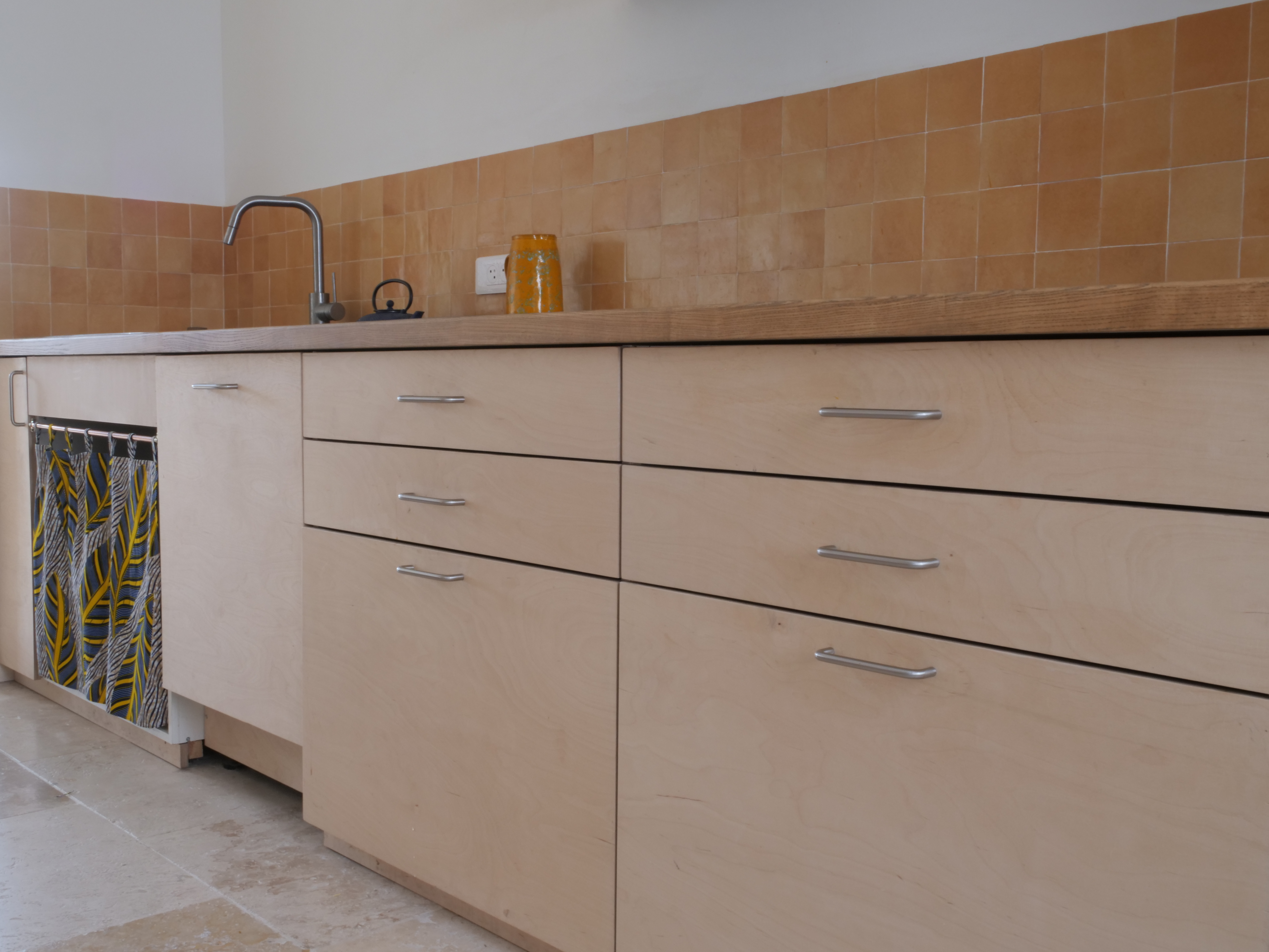 Matériaux : Frêne massif, contreplaqué bouleau, sol en pierre massive, finitions inox brossé, rideaux en tissu wax véritable.