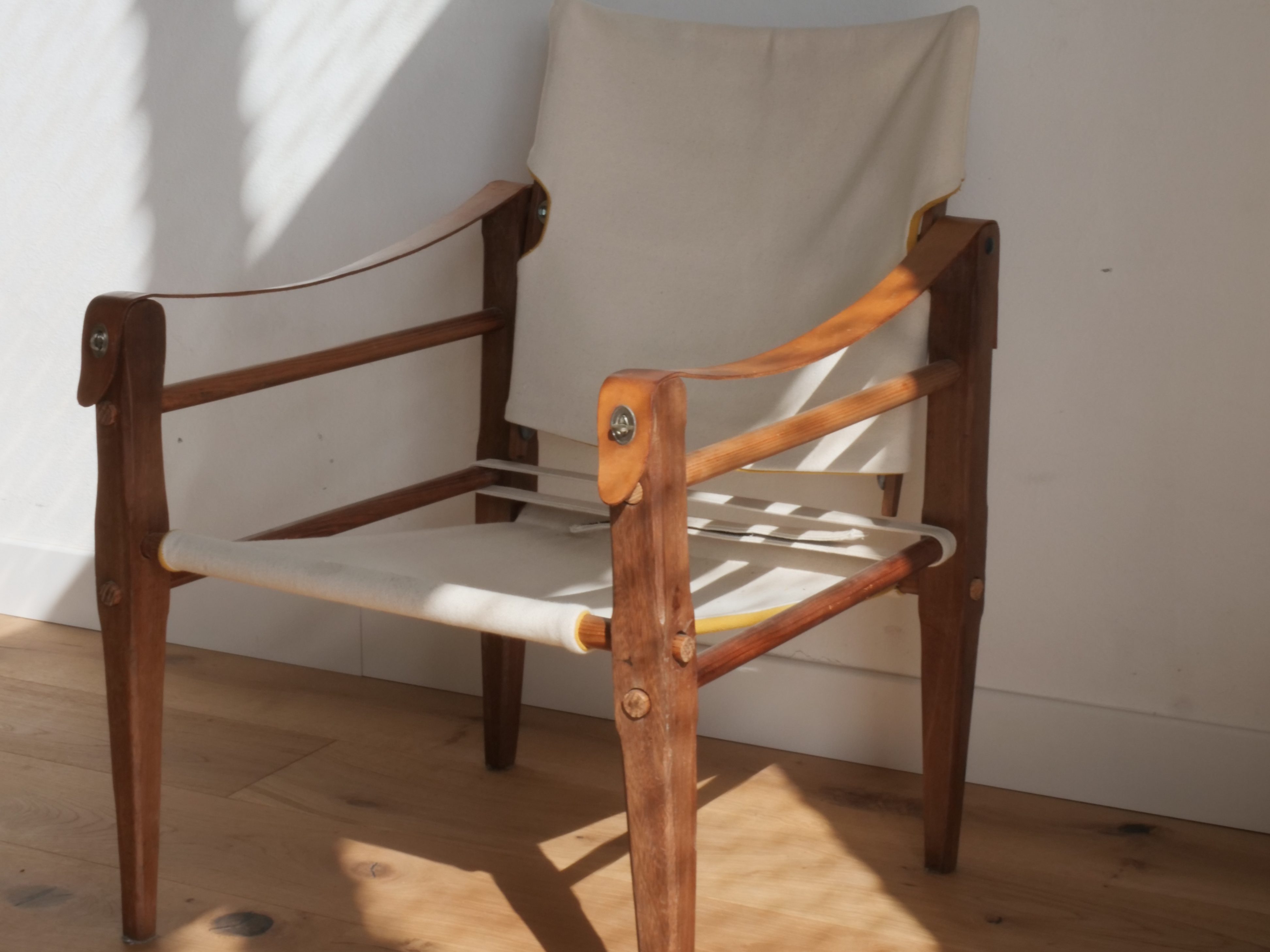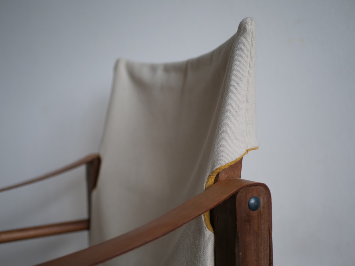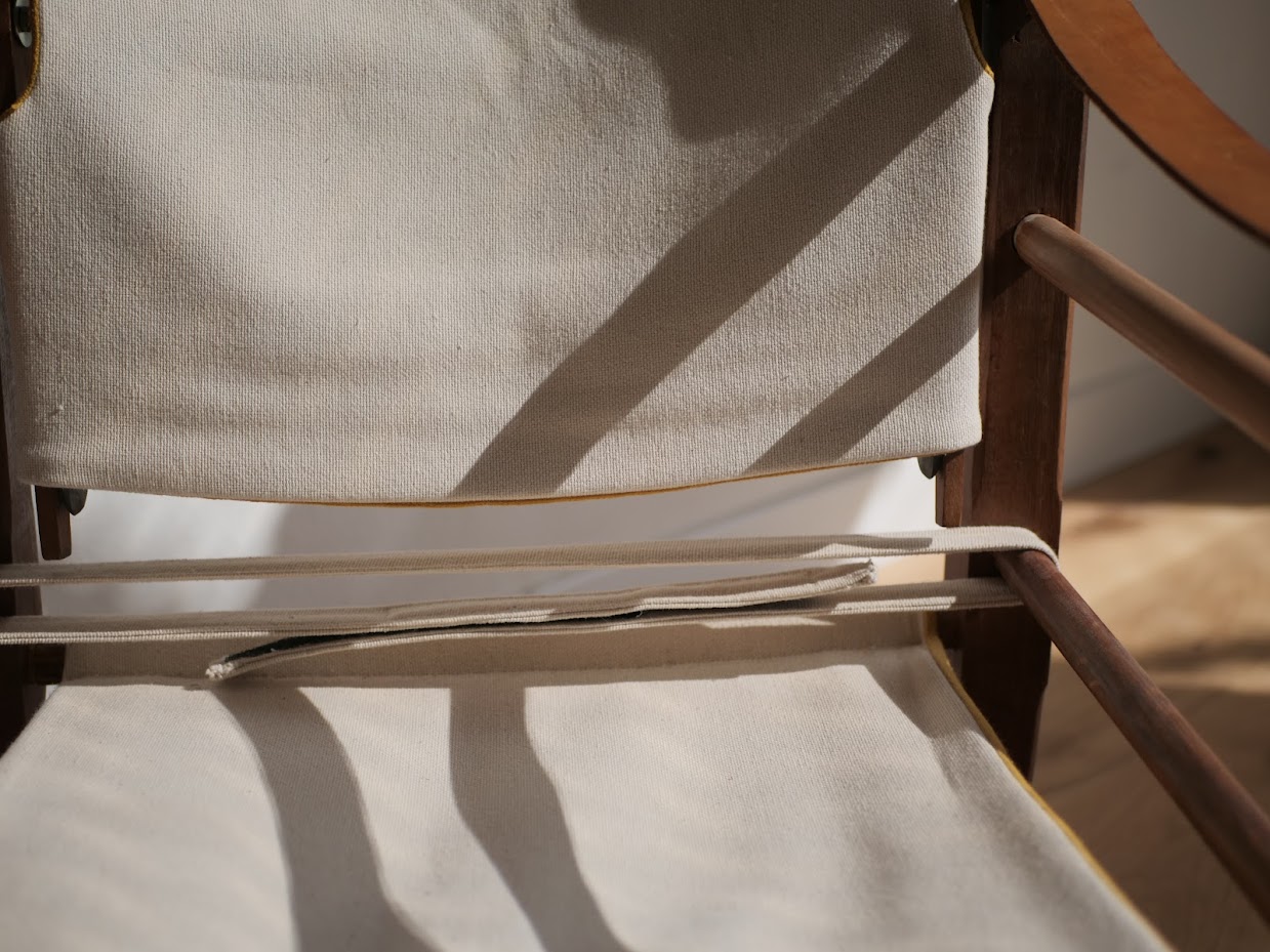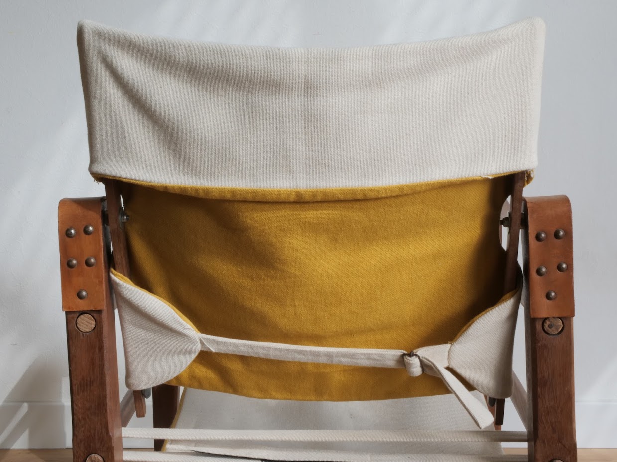 Matériaux : Bois massif exotique, cuir véritable français, toile en coton/lin