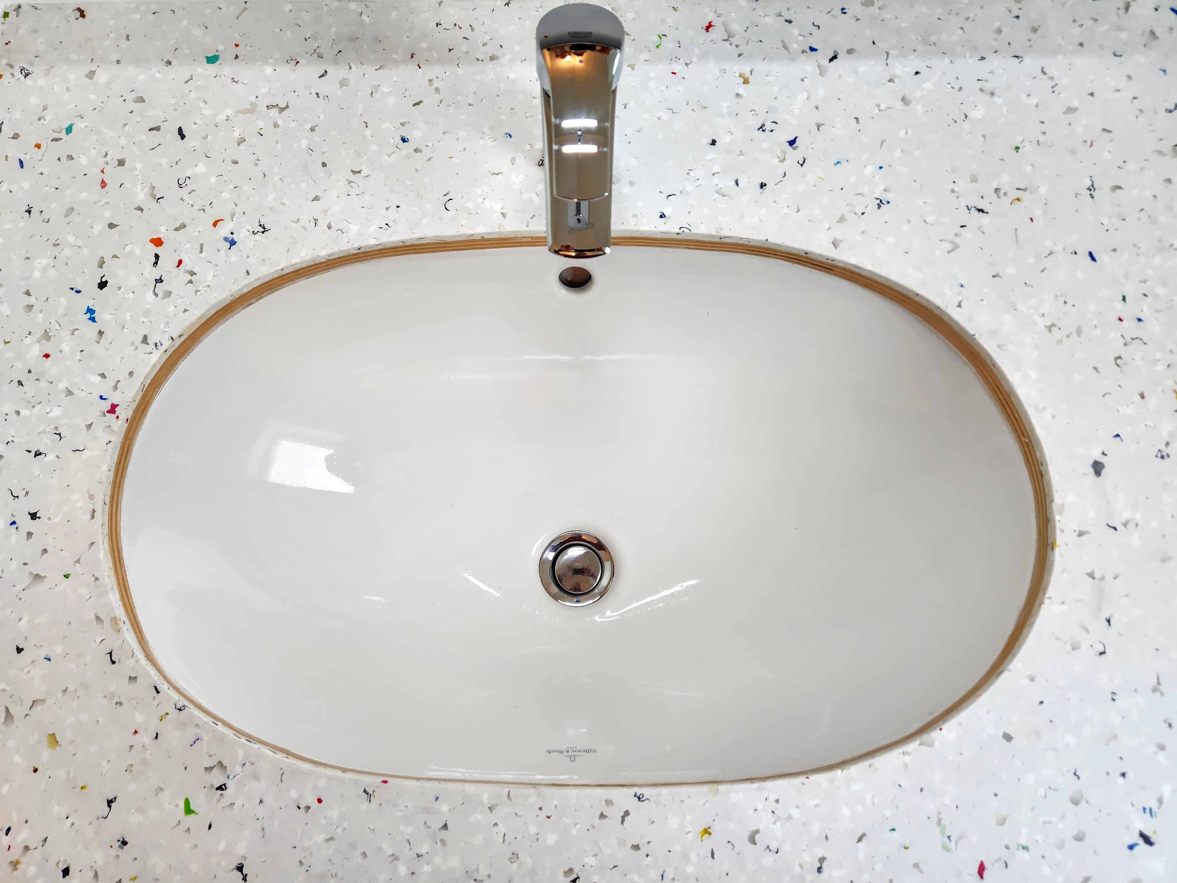 Matériaux : plastique recyclé effet terrazzo Le Pavé®, contreplaqué de peuplier.