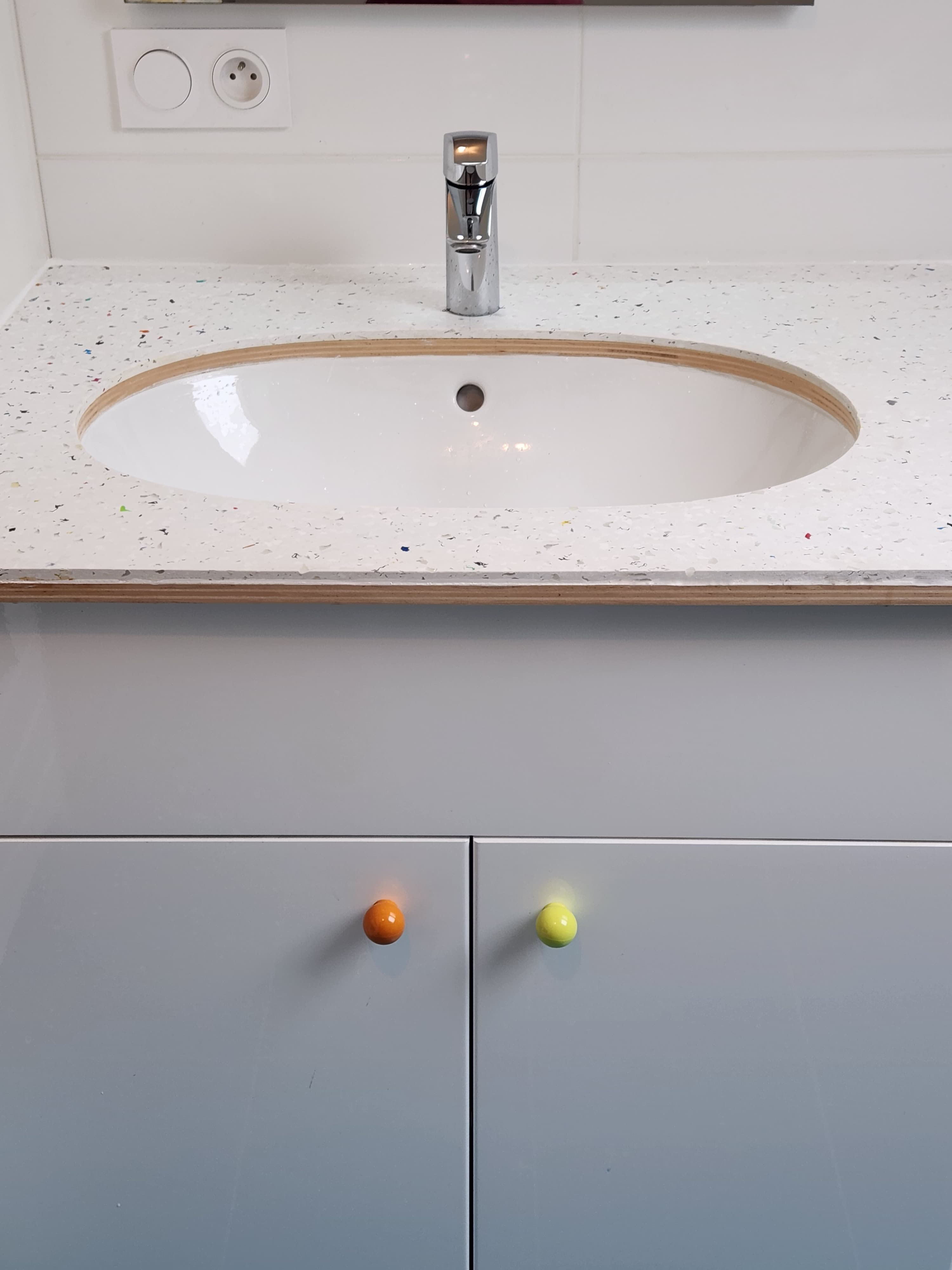 Ce meuble vasque a été réalisé à partir d’un panneau en plastique recyclé de Le Pavé®. Il est complété par un contreplaqué en peuplier, offrant à la fois légèreté et solidité. Conçu pour accueillir un lavabo en céramique monté en sous-face, il allie durabilité et esthétisme. L’association de matériaux recyclés et naturels en fait une pièce au design épuré et sur mesure.